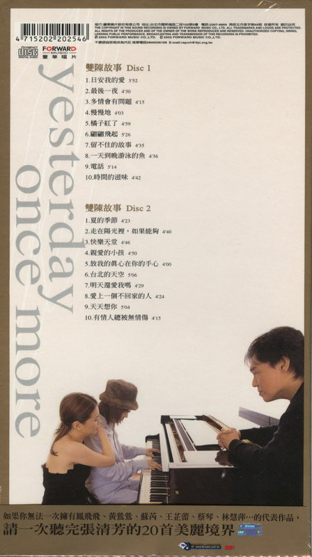 陈志远、陈复明两位乐坛大师留下了无数经典好歌,现在在这套重唱专辑中,由阿芳重新诠释其中的十九首,让我们听见两位大师的毕生好歌,在一首首未曾忘记的乐曲声中,得以温习青春。
